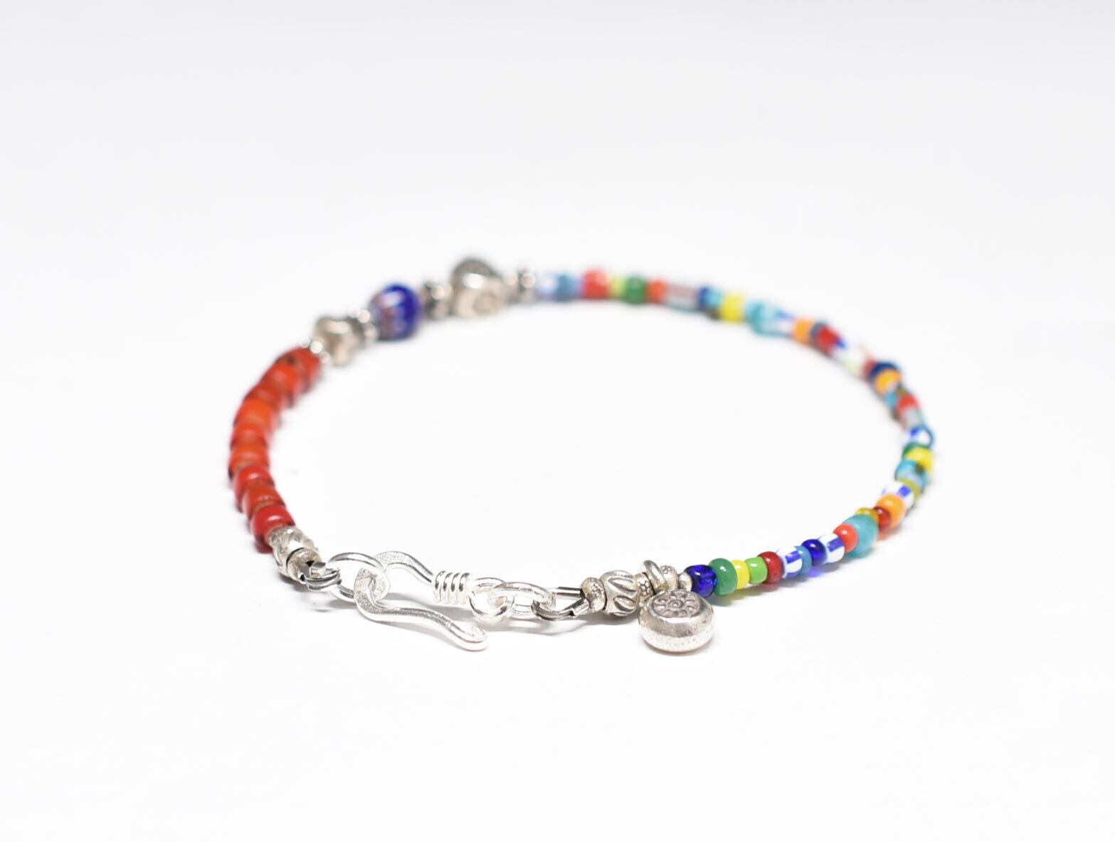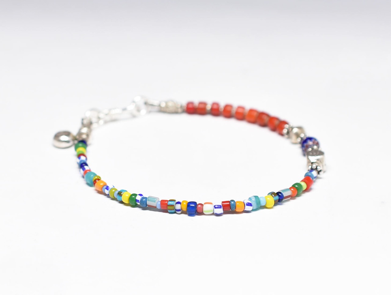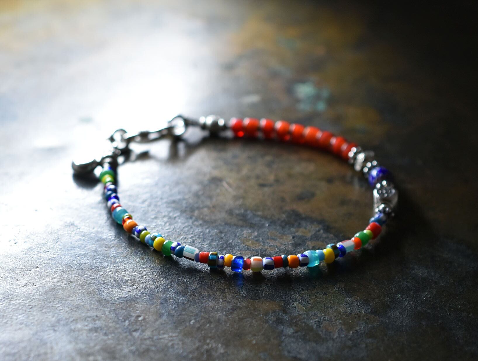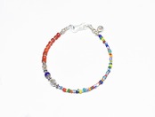 クリスマスビーズと飴色ホワイトハーツ、シェブロン、カレンシルバーを繋いだカラフルなブレスです。