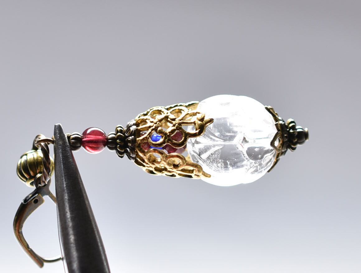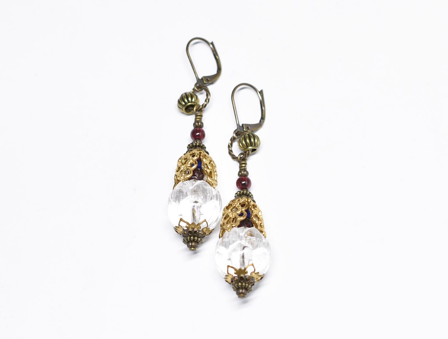 蓮華クリスタルと繊細装飾ブラスキャップ、ガーネット、隠しブルービーズのピアス