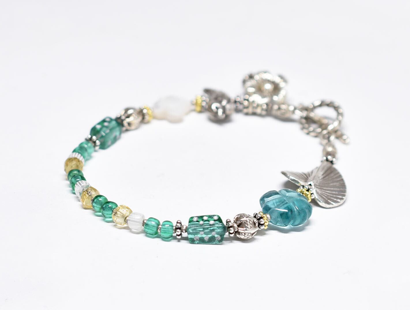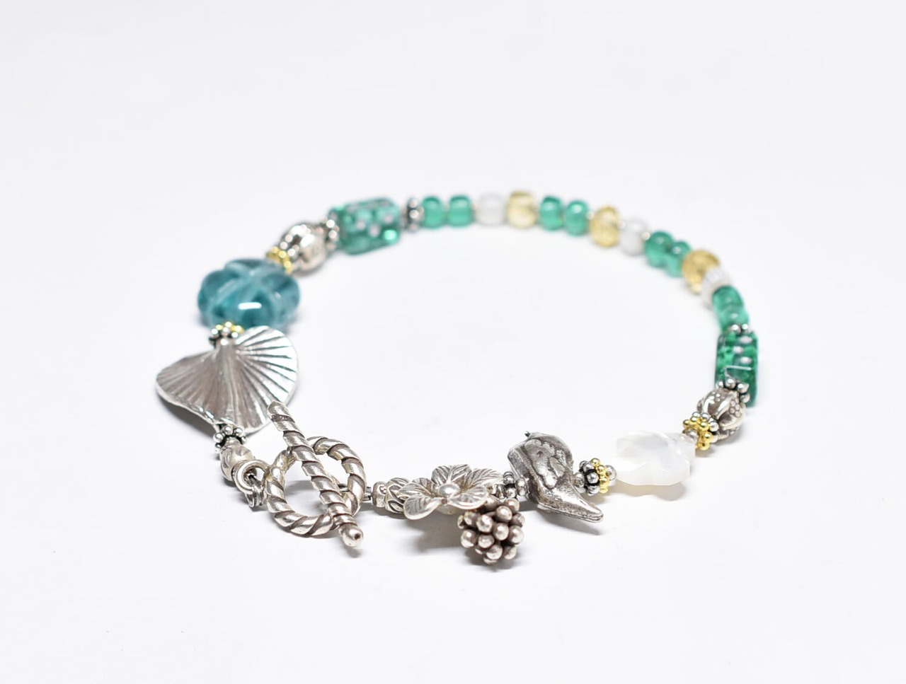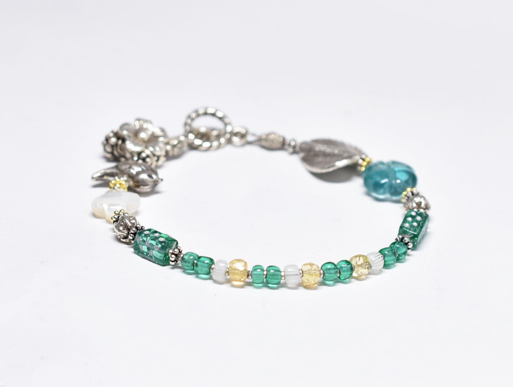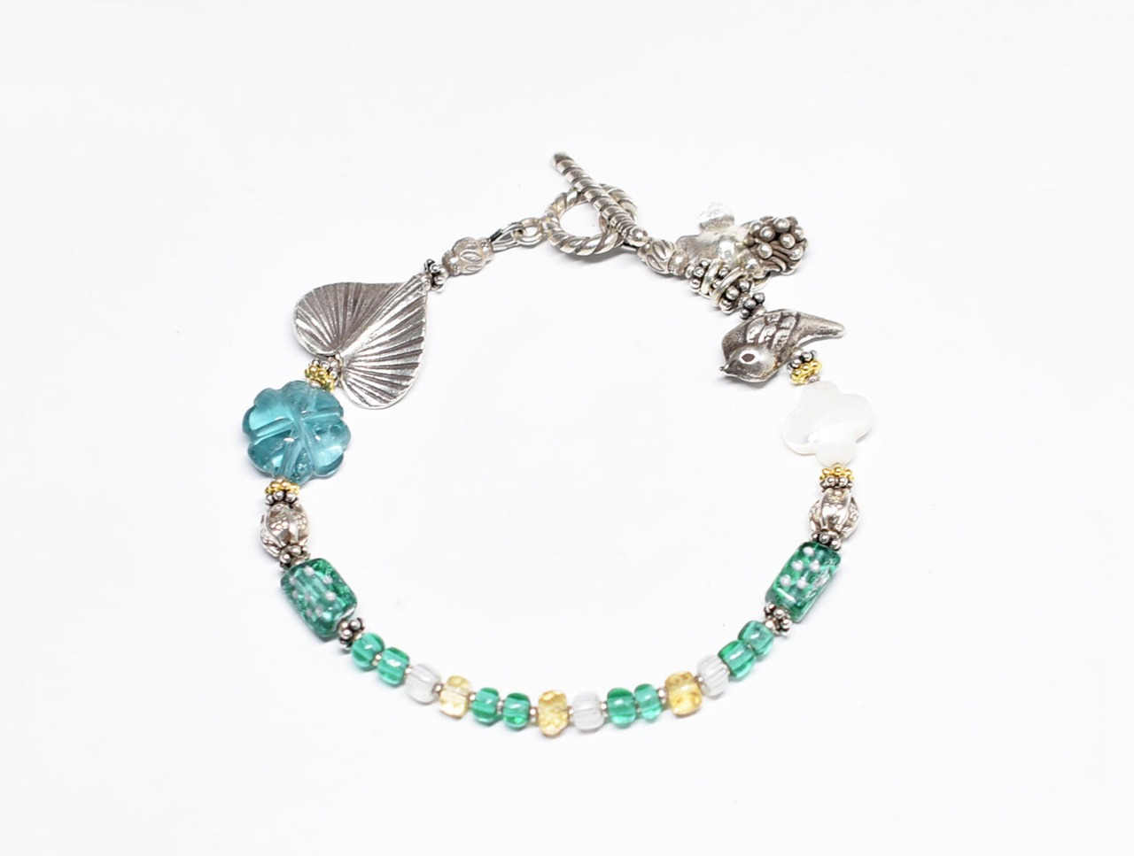 クローバーフローライト&白蝶貝、ダイスビーズ、グーズベリー、グリーンビーズ、シトリン、ボタニカル&小鳥カレンシルバーのブレス