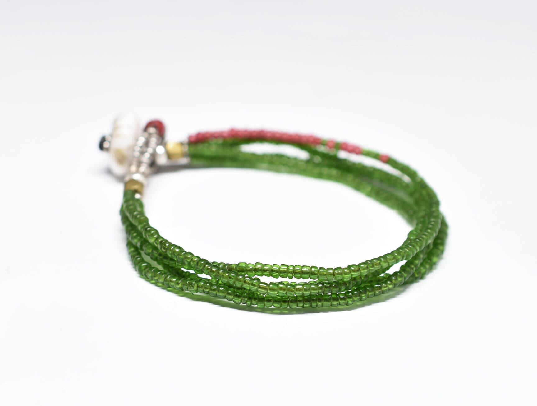 アンティークグリーンシードビーズと金赤ホワイトハーツを繋いだ4連ブレスです。