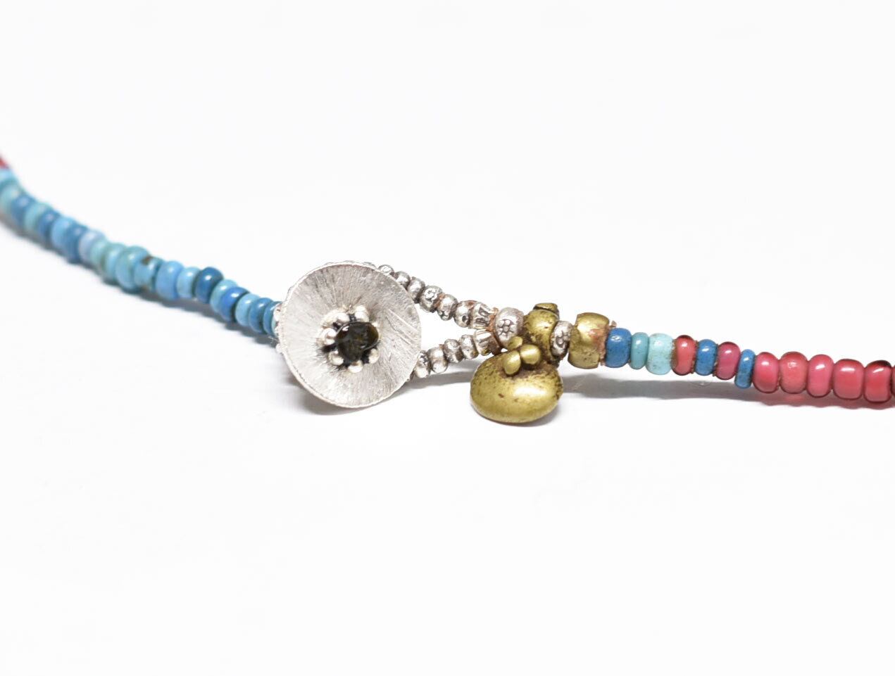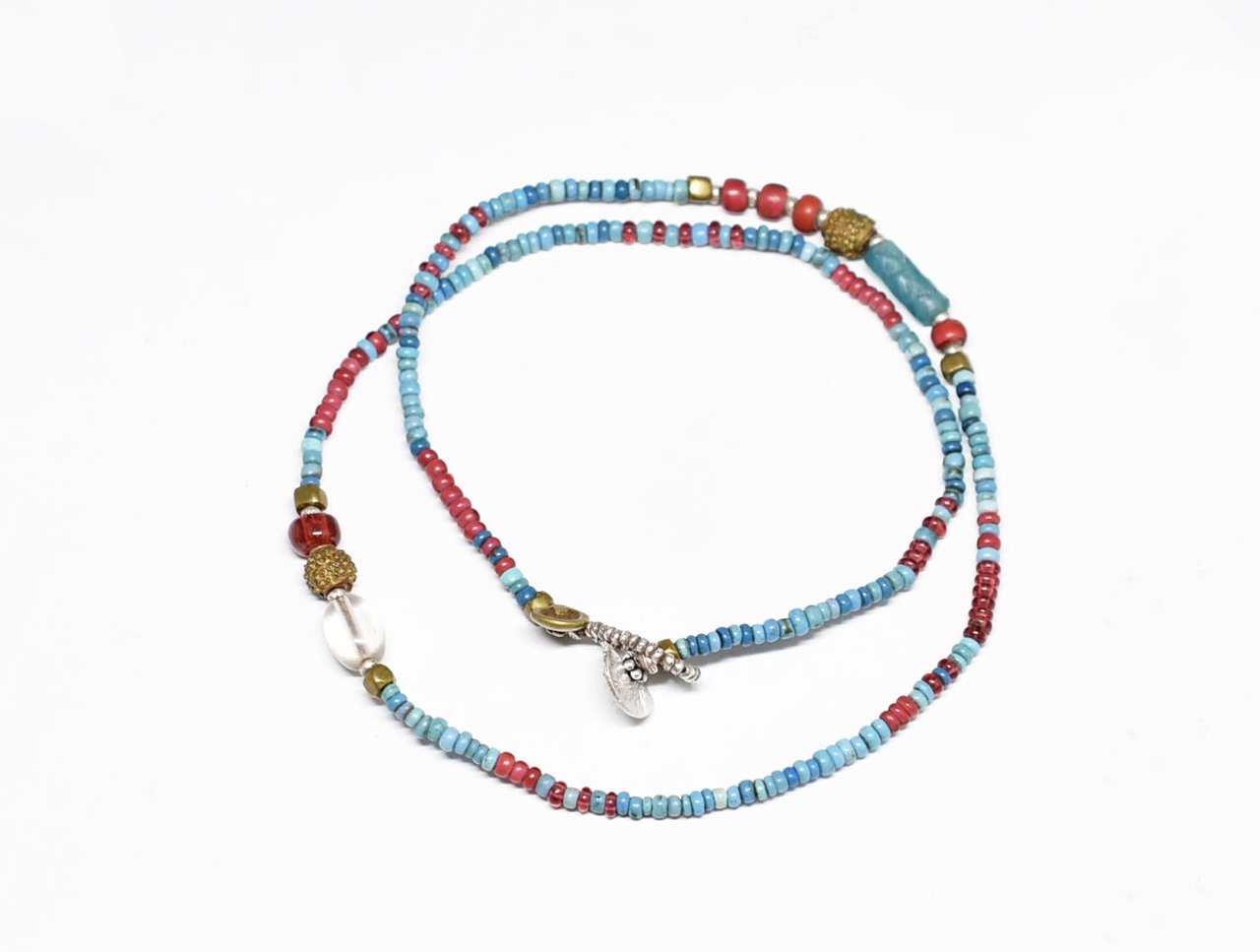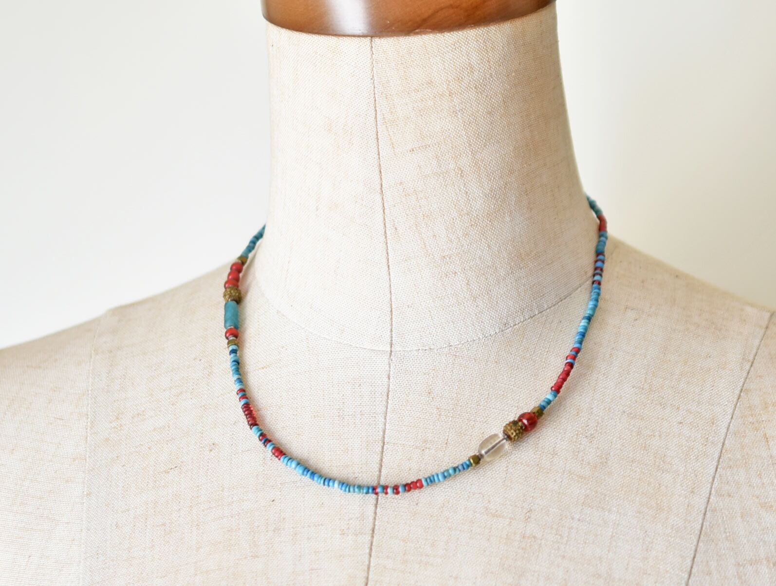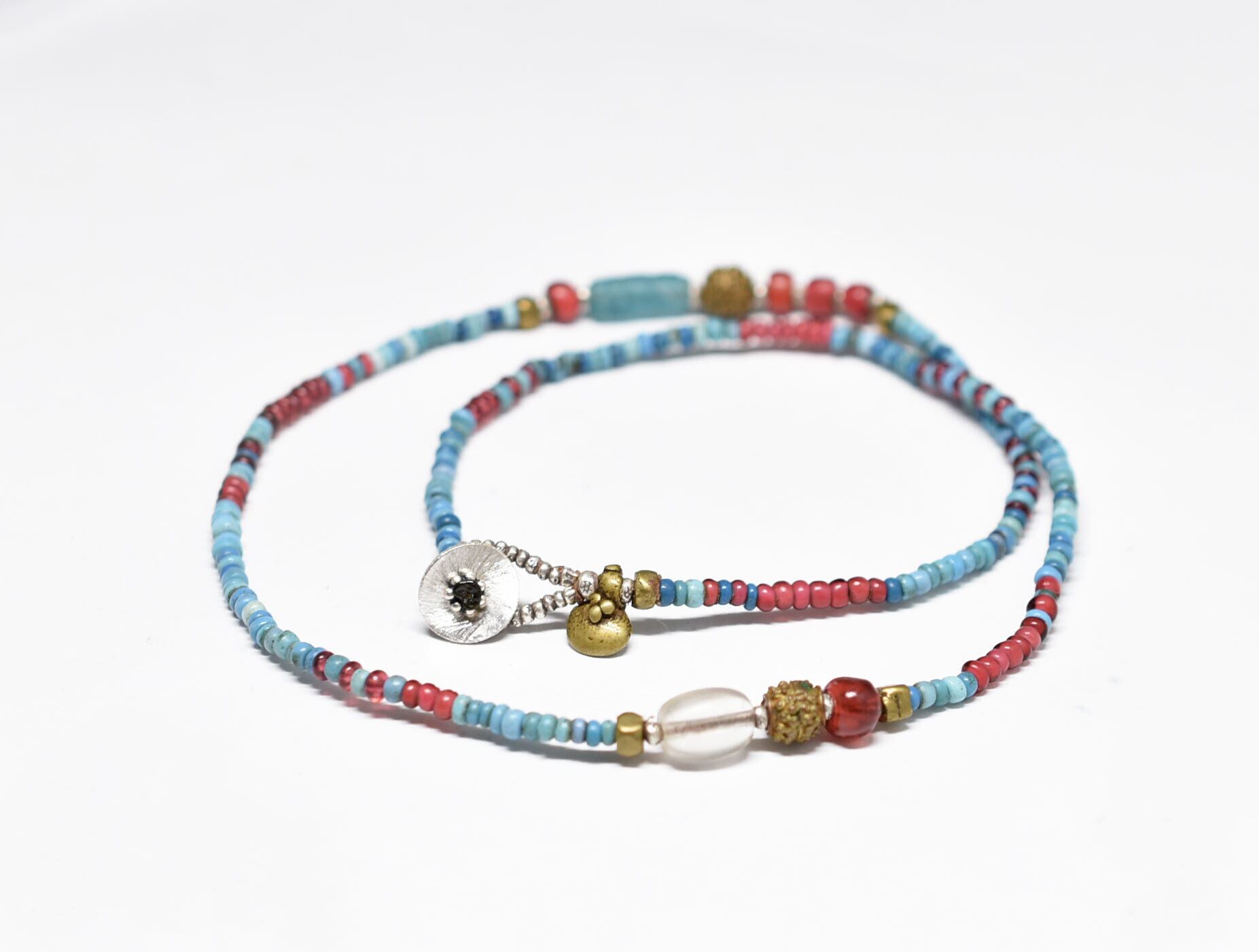 アンティークボヘミアビーズと金赤ビーズ、つぶつぶブラス、ローマングラス、多彩水色シードビーズ&金赤ホワイトハーツ、oldオリッサブラスの華奢なネックレス