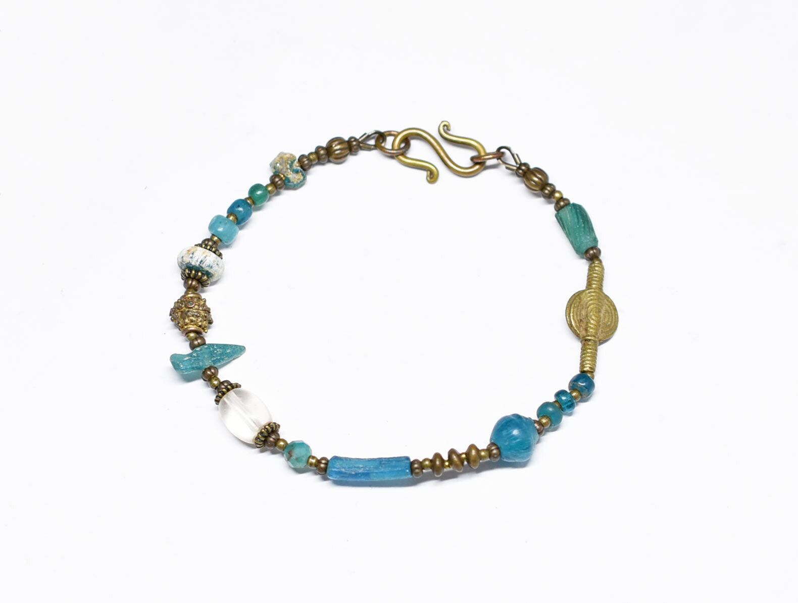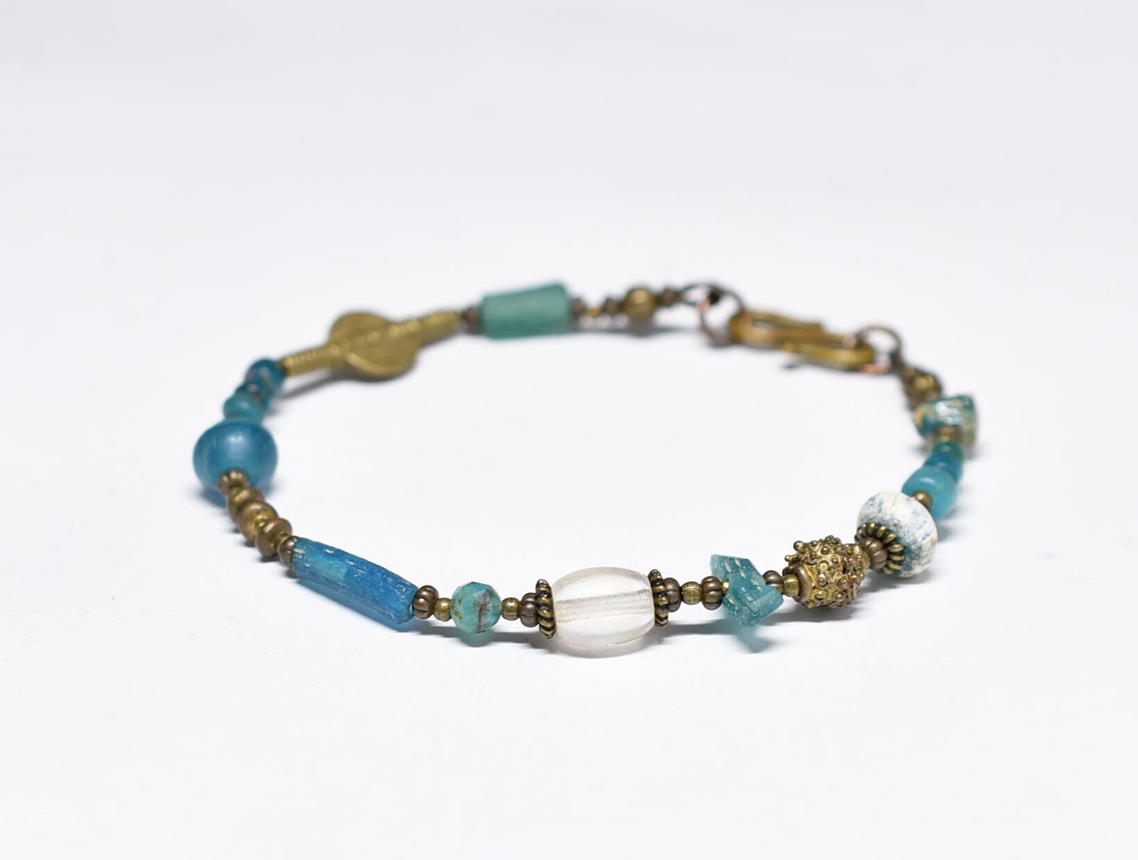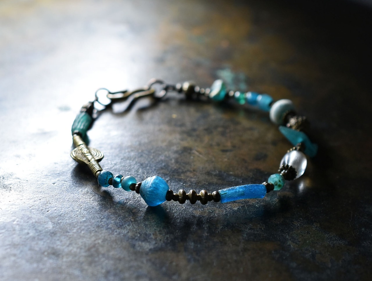 エメラルドブルーローマン多彩ローマングラスとアンティークボヘミアビーズ、民族ブラス、発掘ビーズのブレス