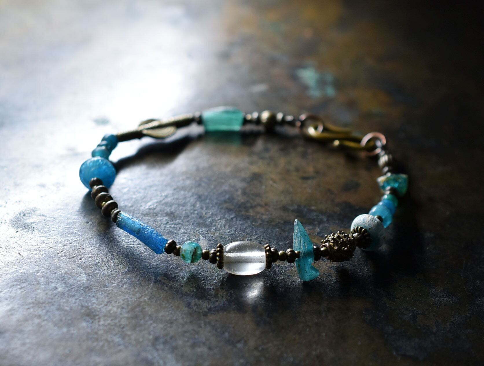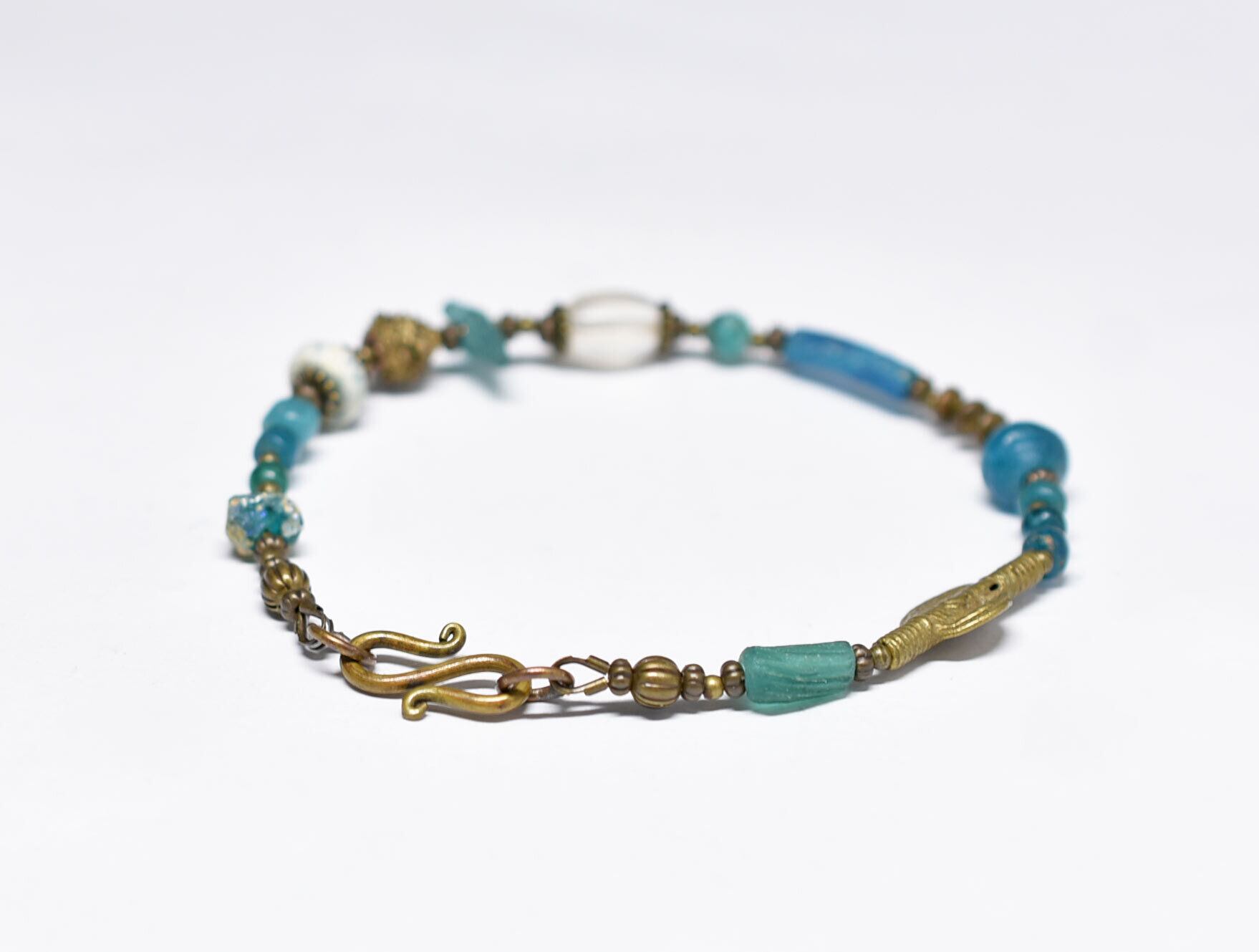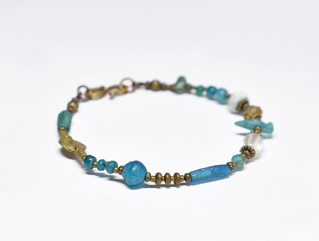 エメラルドブルーローマン多彩ローマングラスとアンティークボヘミアビーズ、民族ブラス、発掘ビーズのブレス