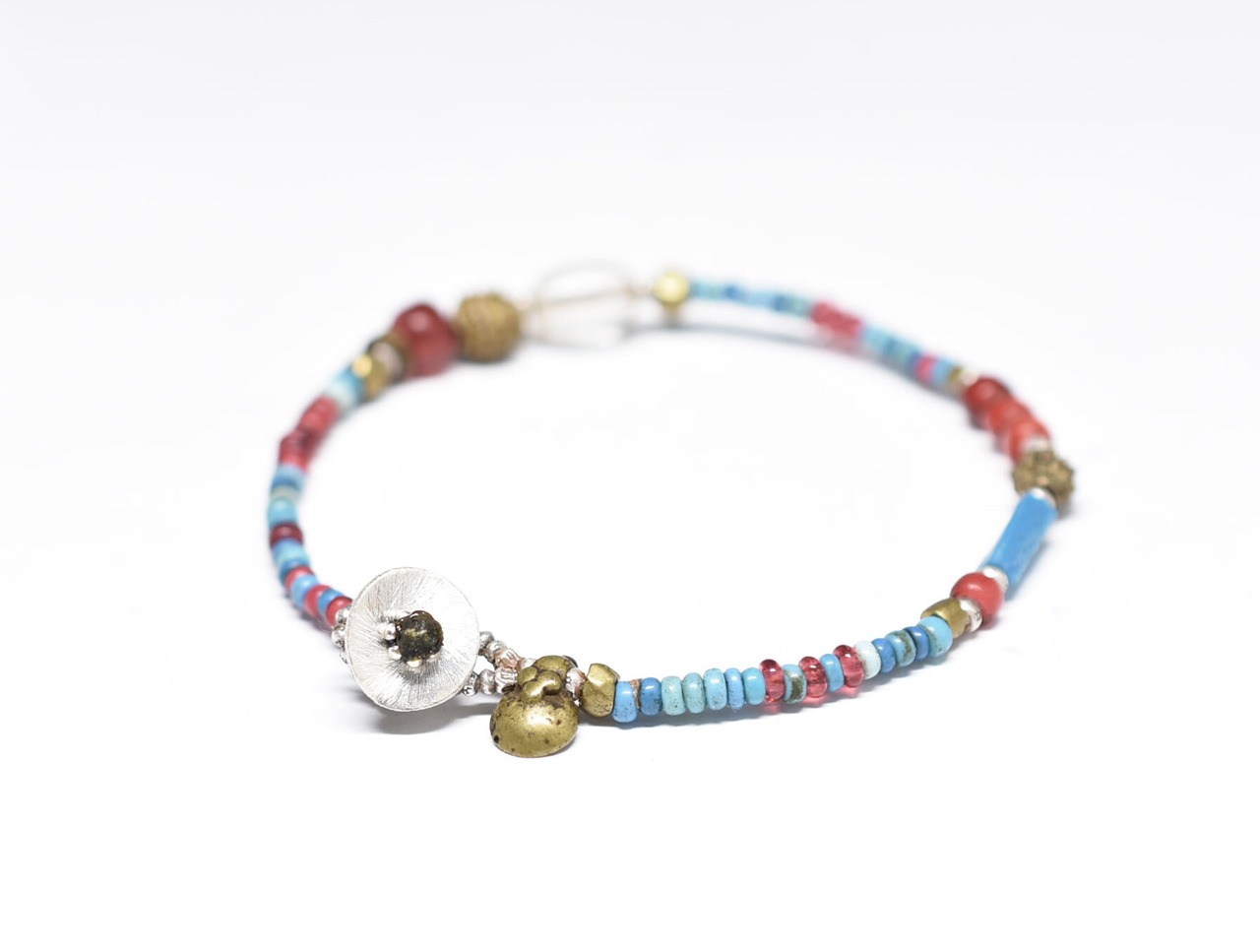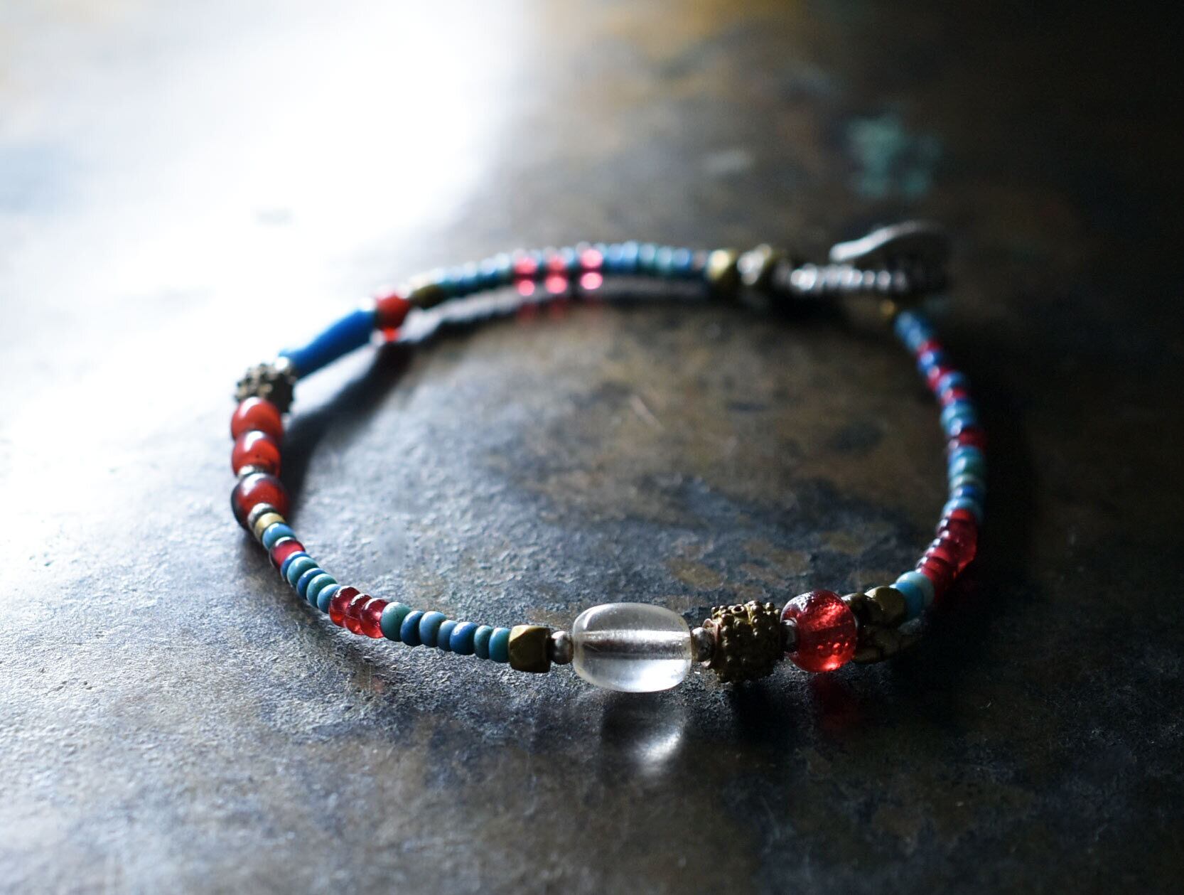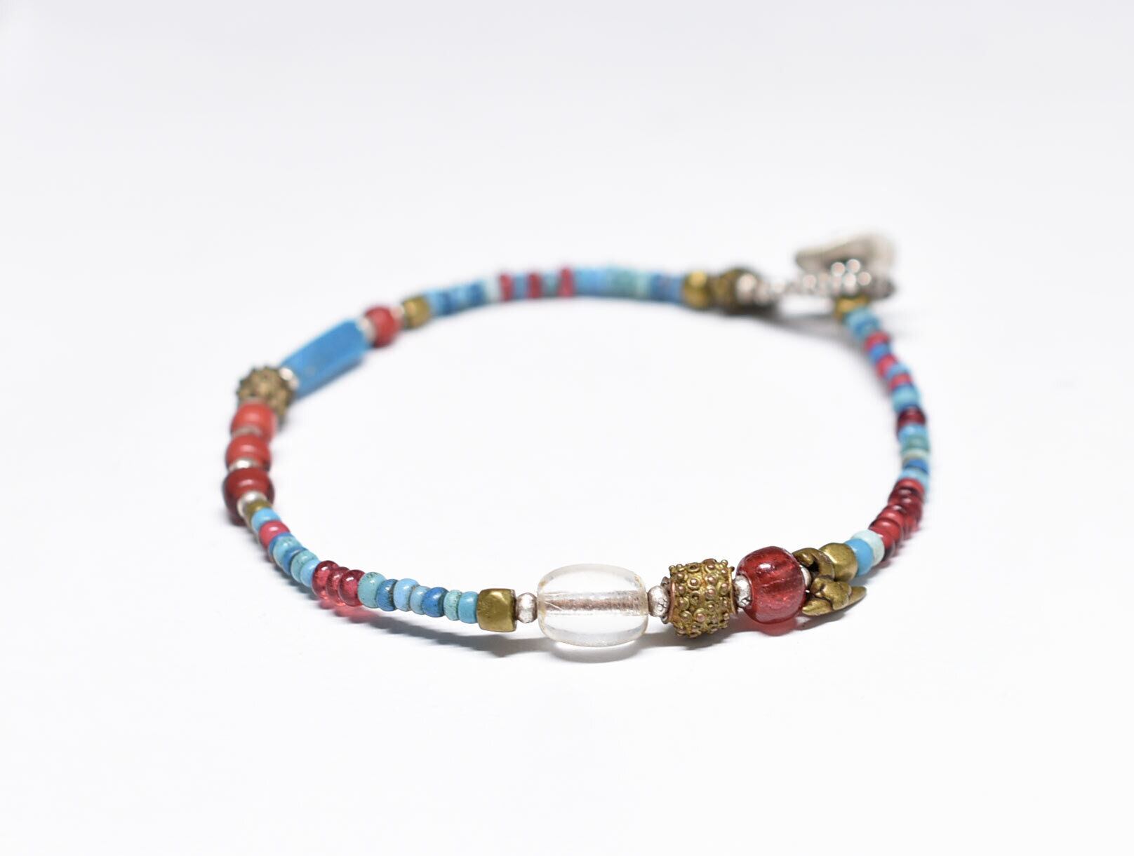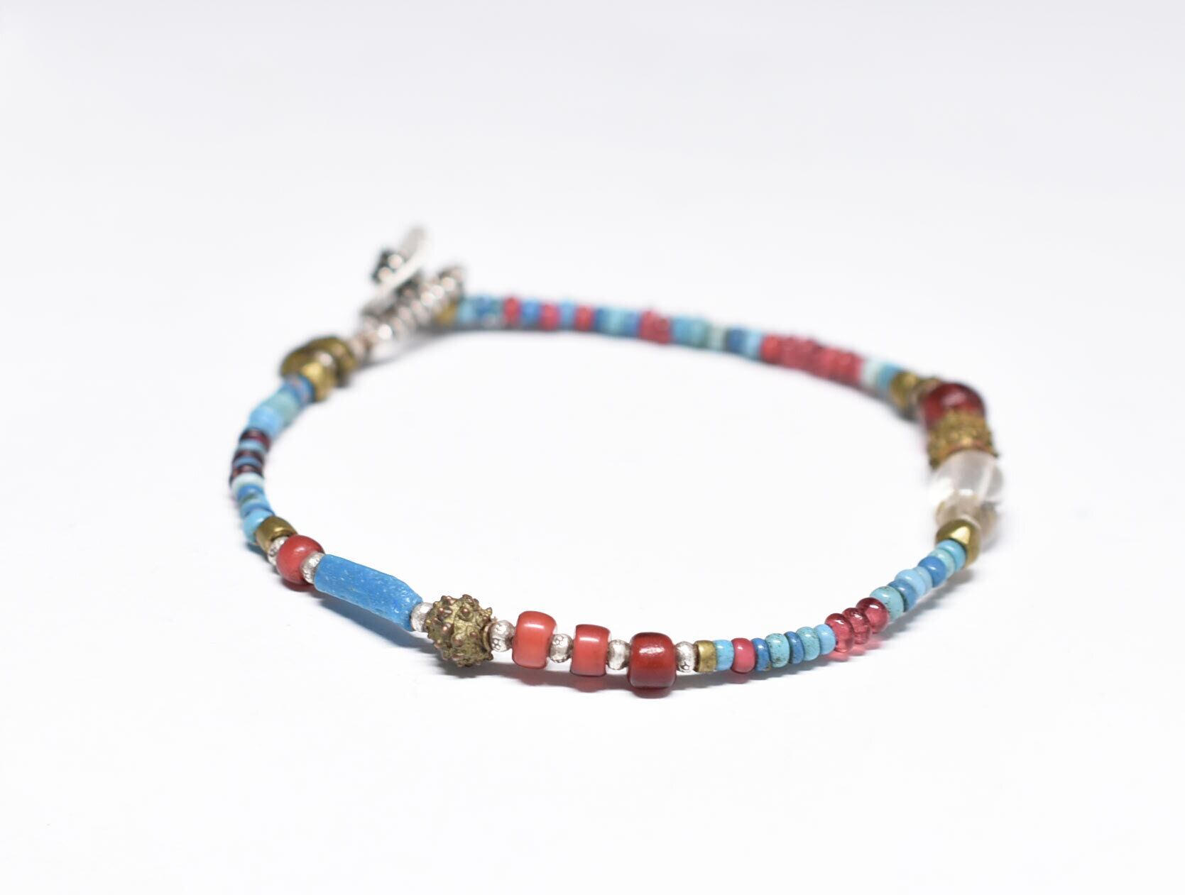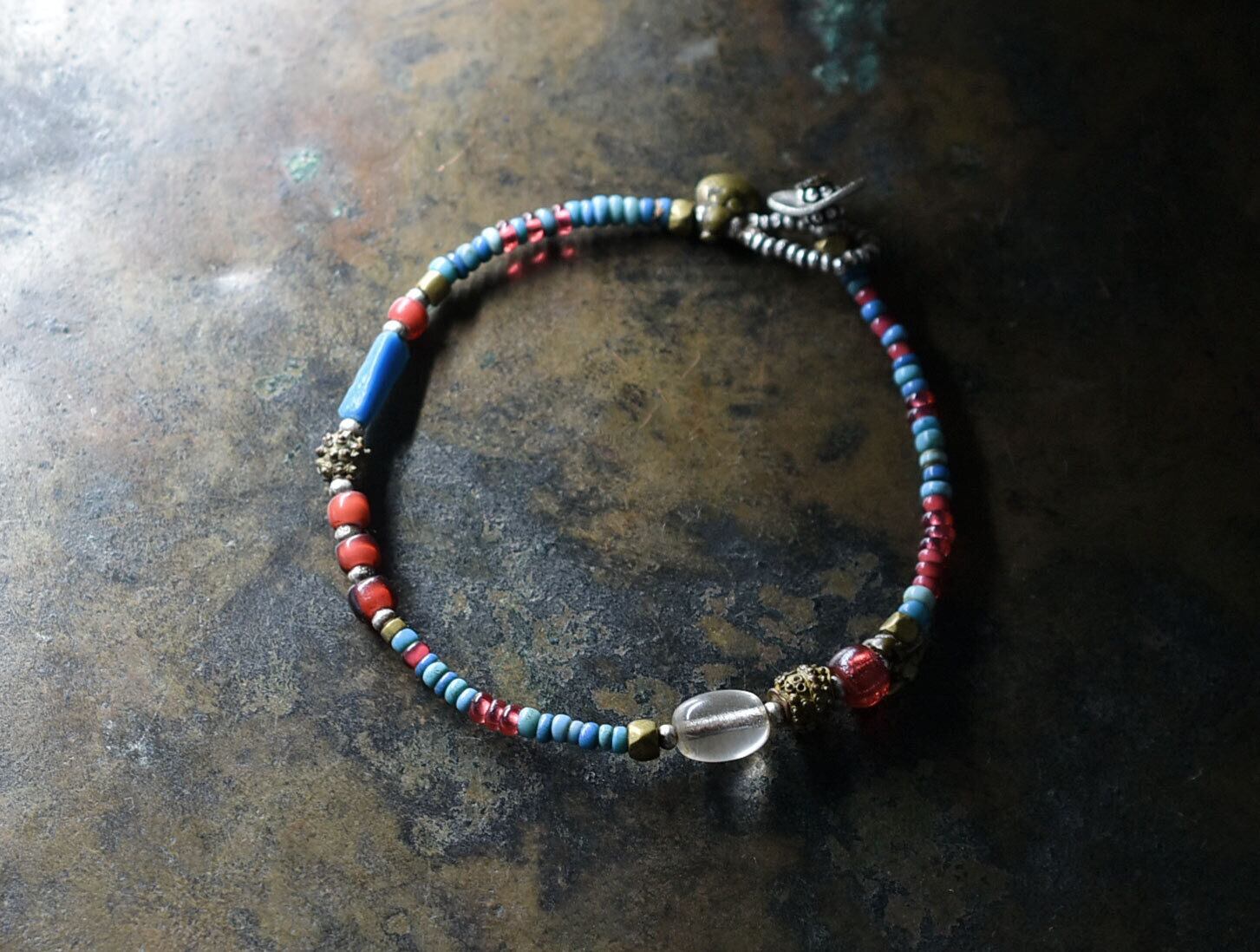 アンティークボヘミアビーズと金赤ビーズ、つぶつぶブラス、ローマングラス、多彩水色シードビーズ&金赤ホワイトハーツ、oldオリッサブラスの華奢なブレス