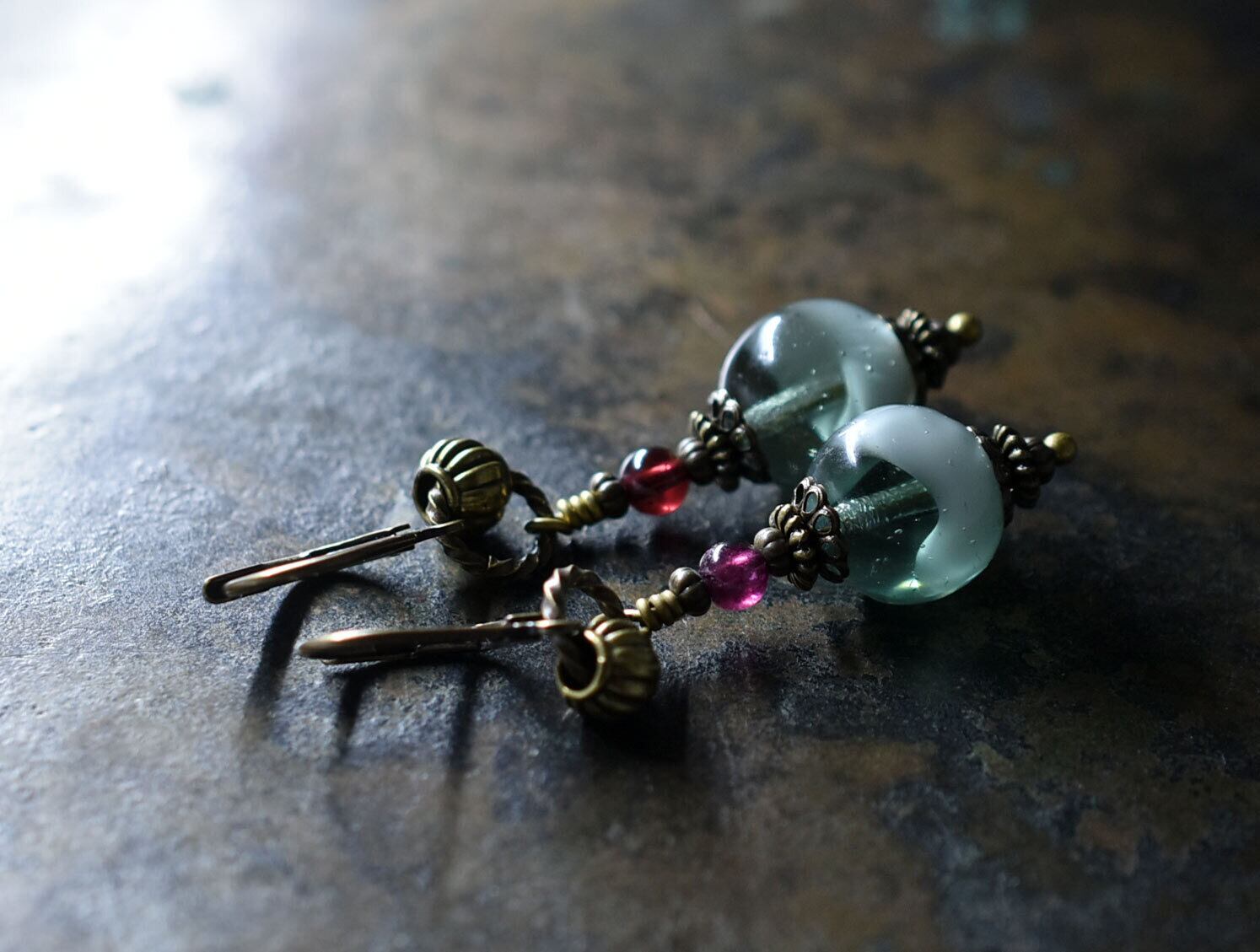 グリーングレーフランスヴィンテージビーズとガーネットのピアス