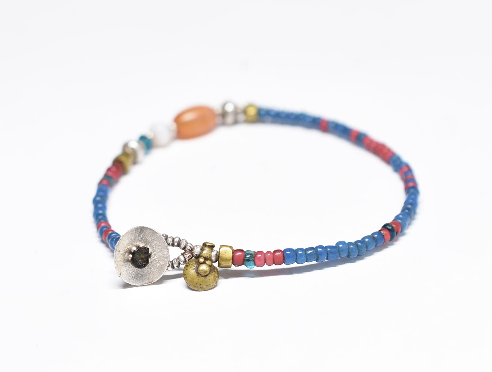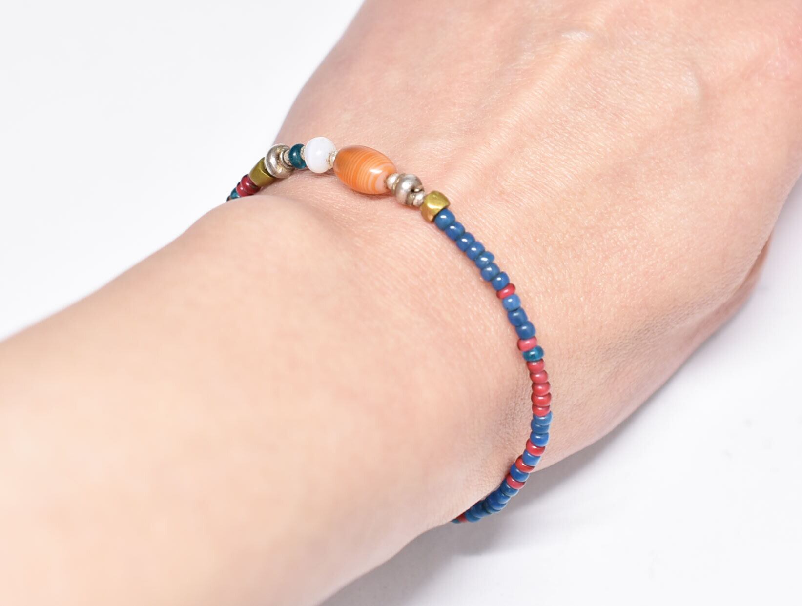 サックスブルーシードビーズと金赤ホワイトハーツ、エメラルドブルービーズ、シャン族ヴィンテージカーネリアン、古代瑪瑙、oldチンシルバー&オリッサブラスの華奢なブレス