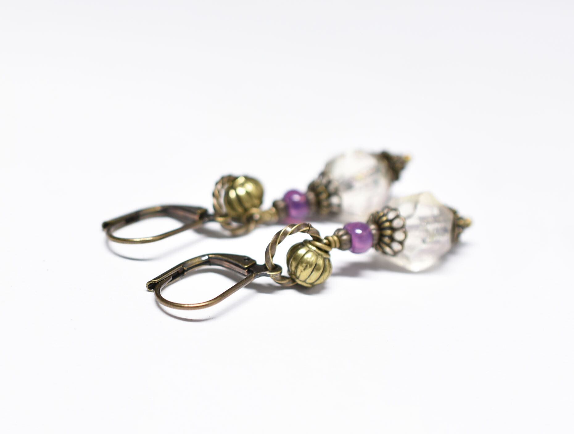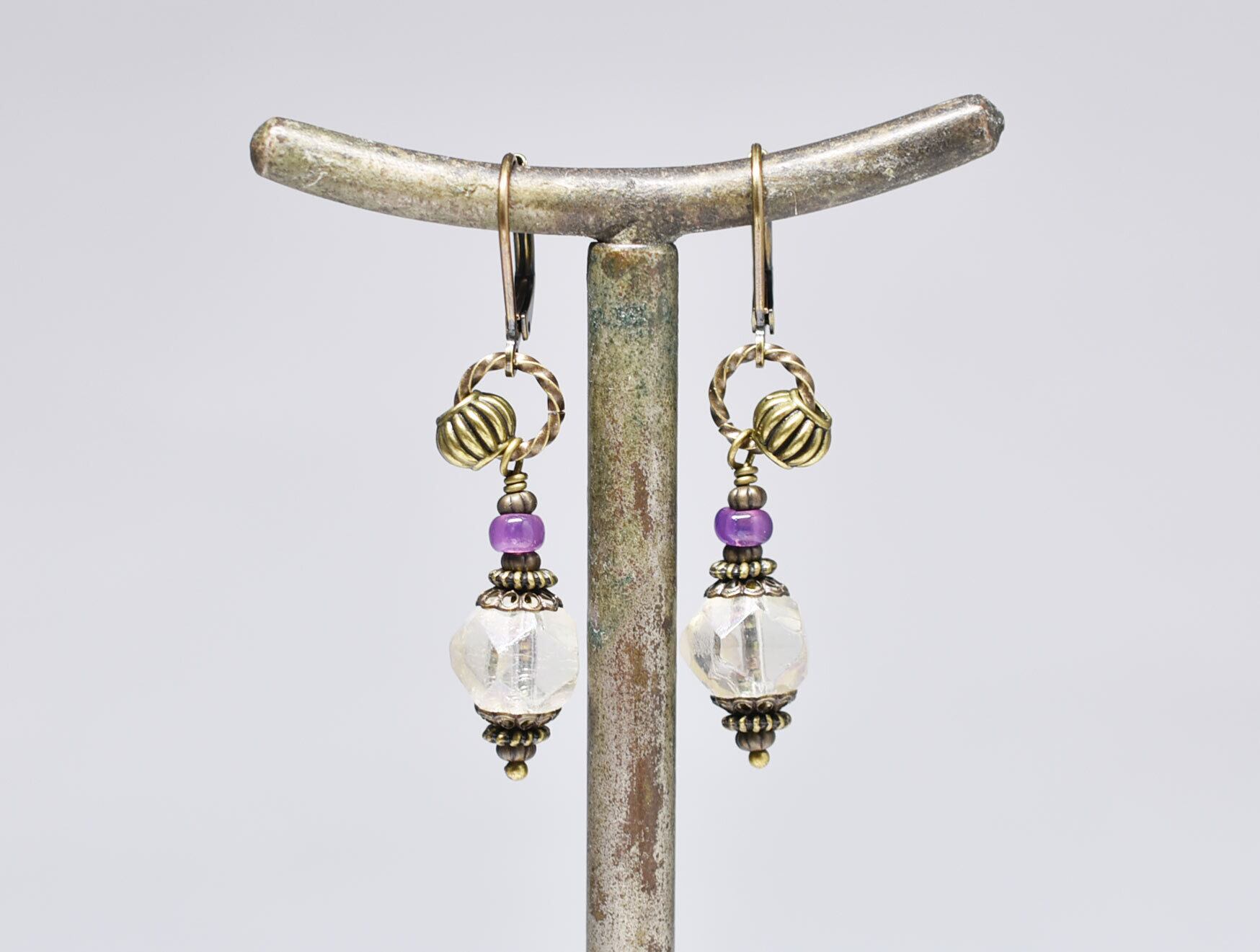 ィンテージのチェコビーズとフランスヴィンテージすみれ色ビーズを少し大き目なリングで繋いだピアスです。