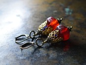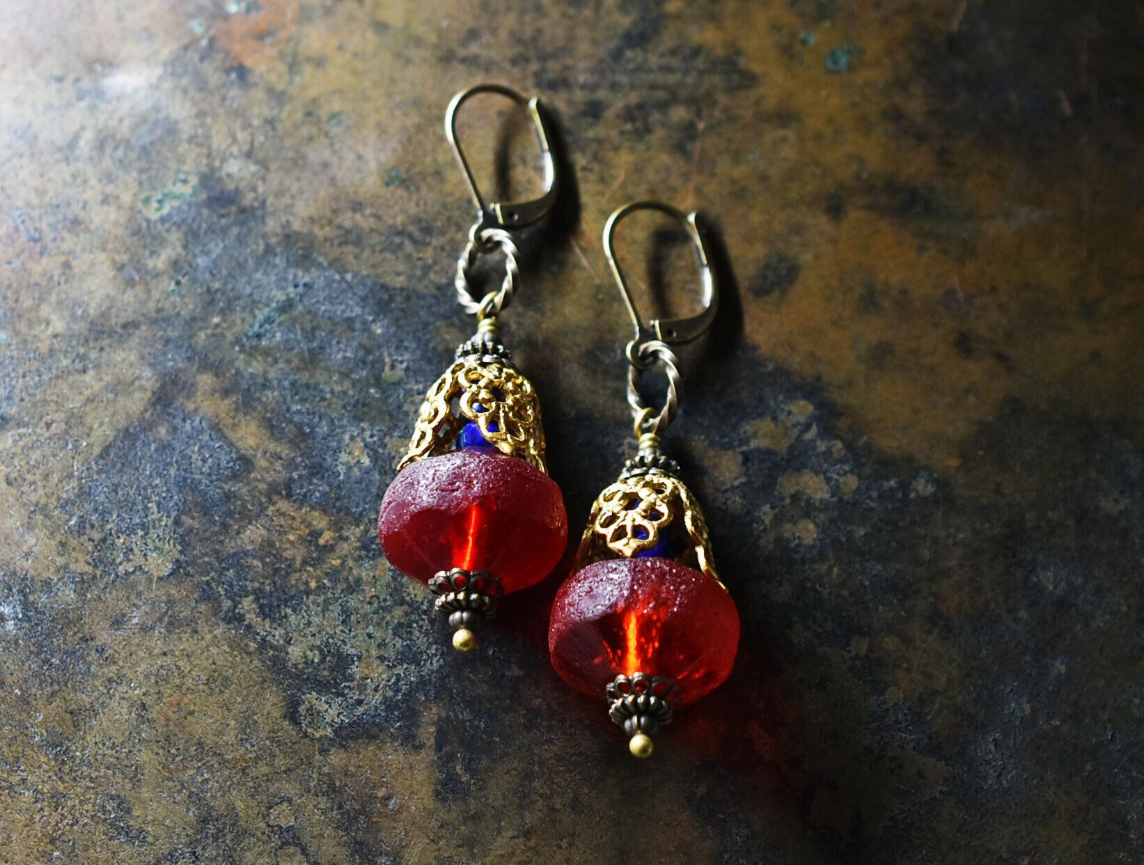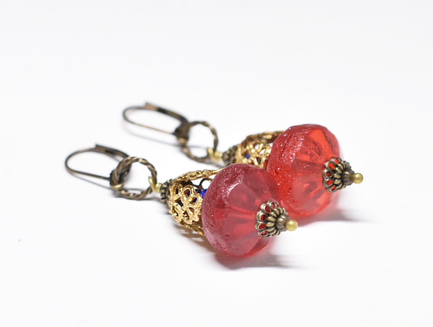 真っ赤な算盤型アンティークボヘミアビーズと繊細装飾ブラスキャップ、ラピスとブルービーズのピアス