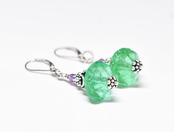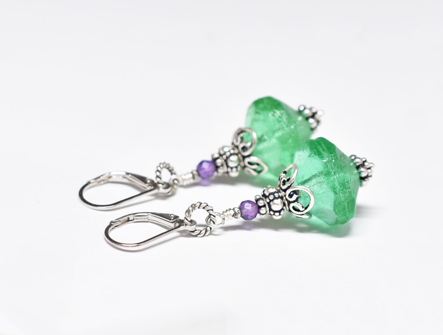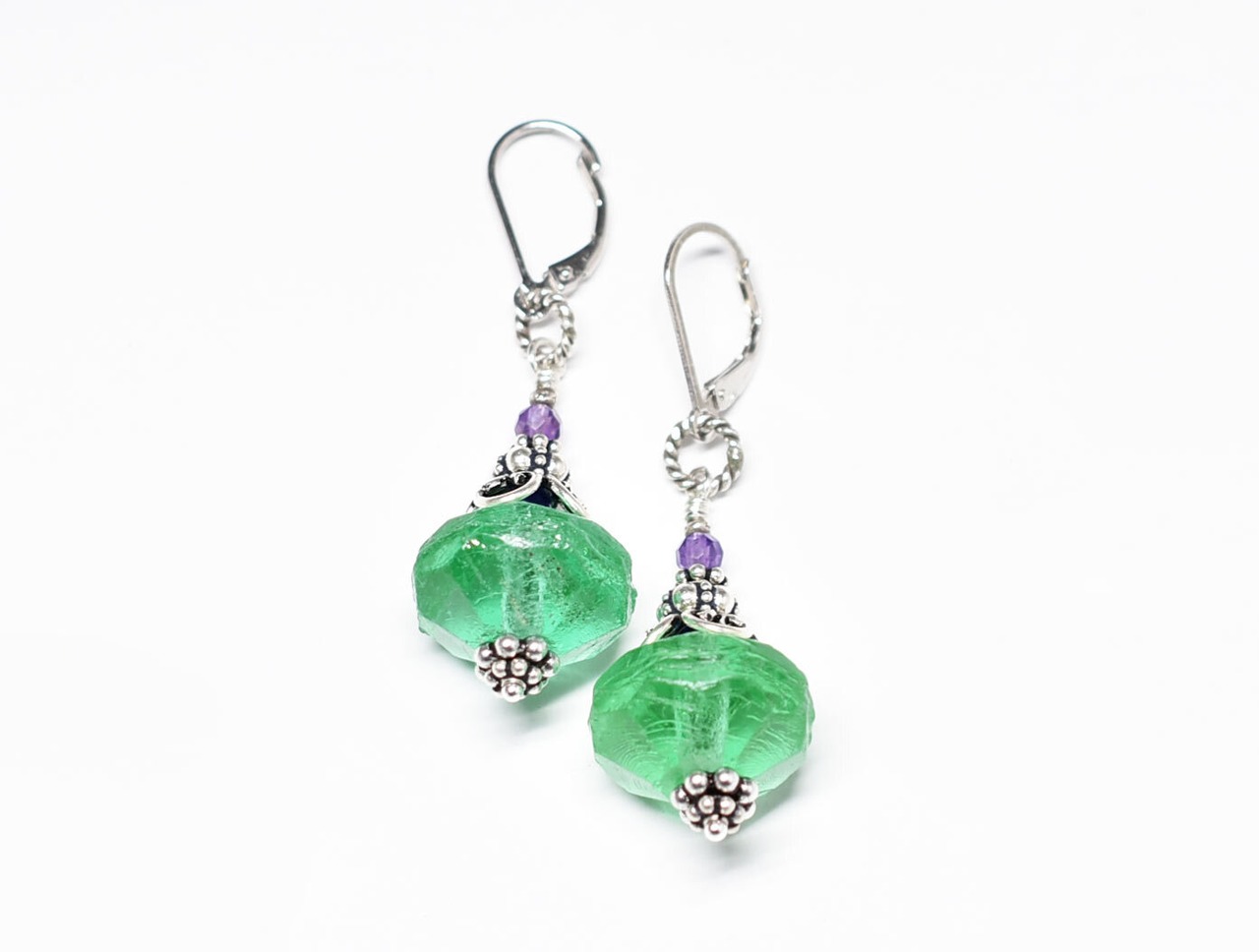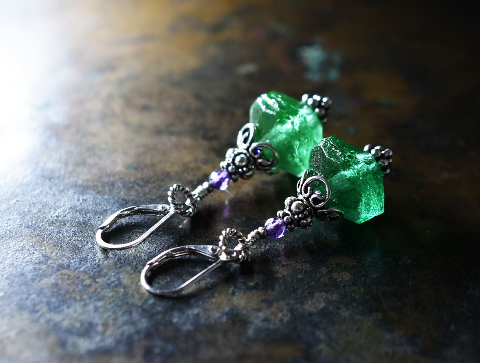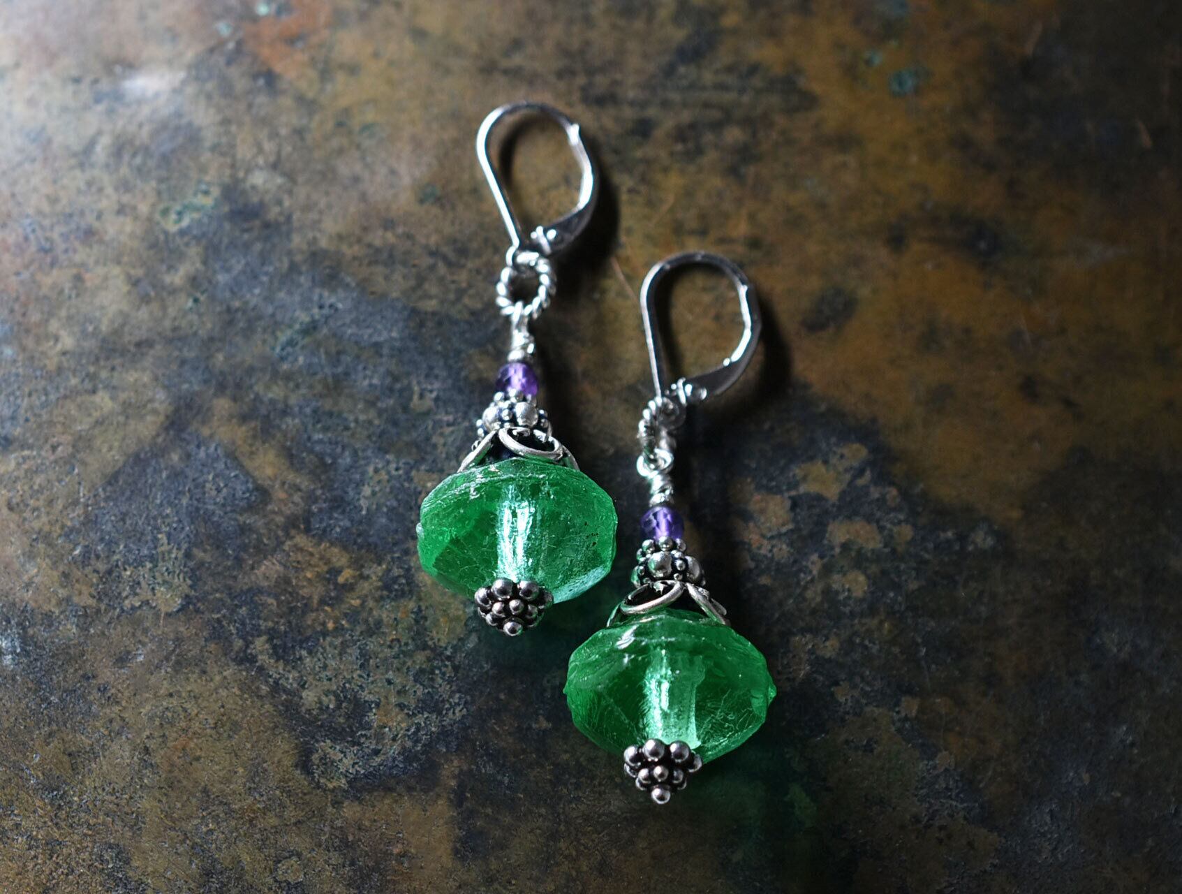 アンティークウランガラスと多彩シルバービーズ、アメジストのピアス