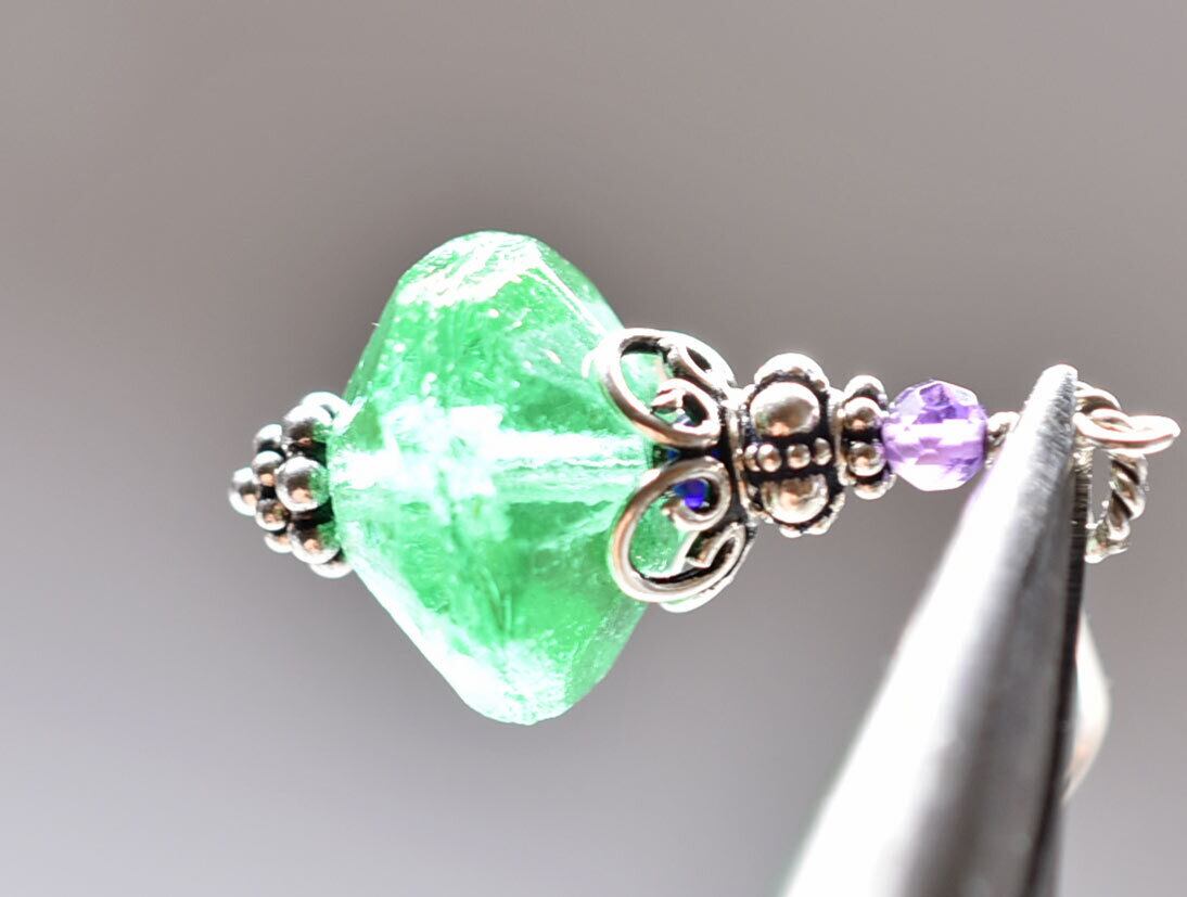 独特なセミクリアグリーンのビーズは、極々微量のウランで発色させています。ブラックライトを当てると光ります!