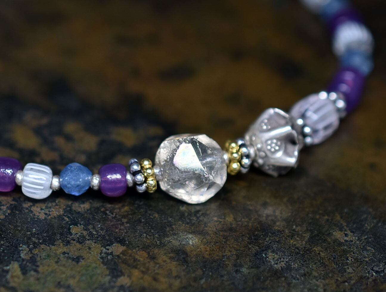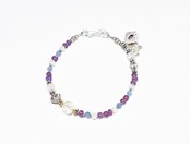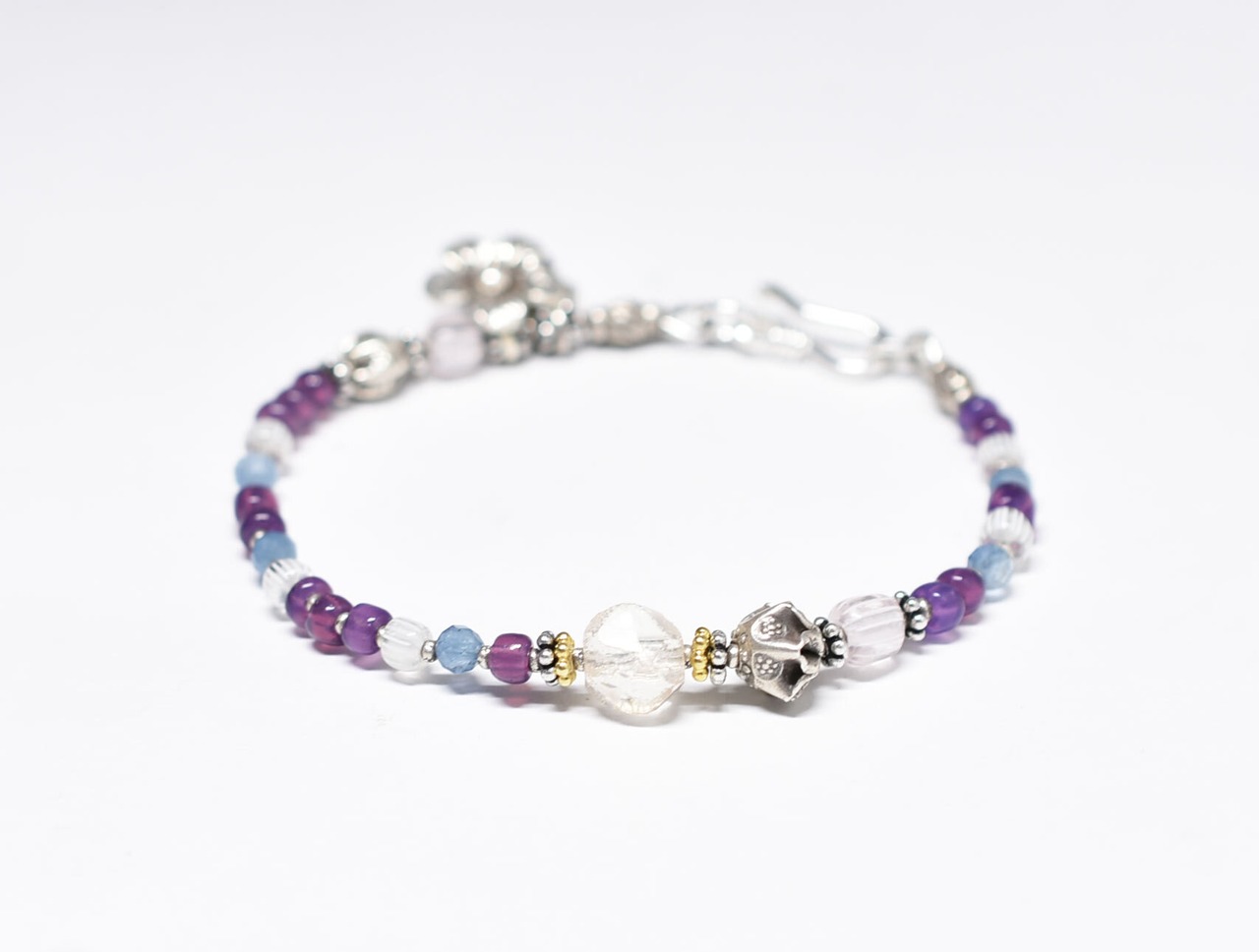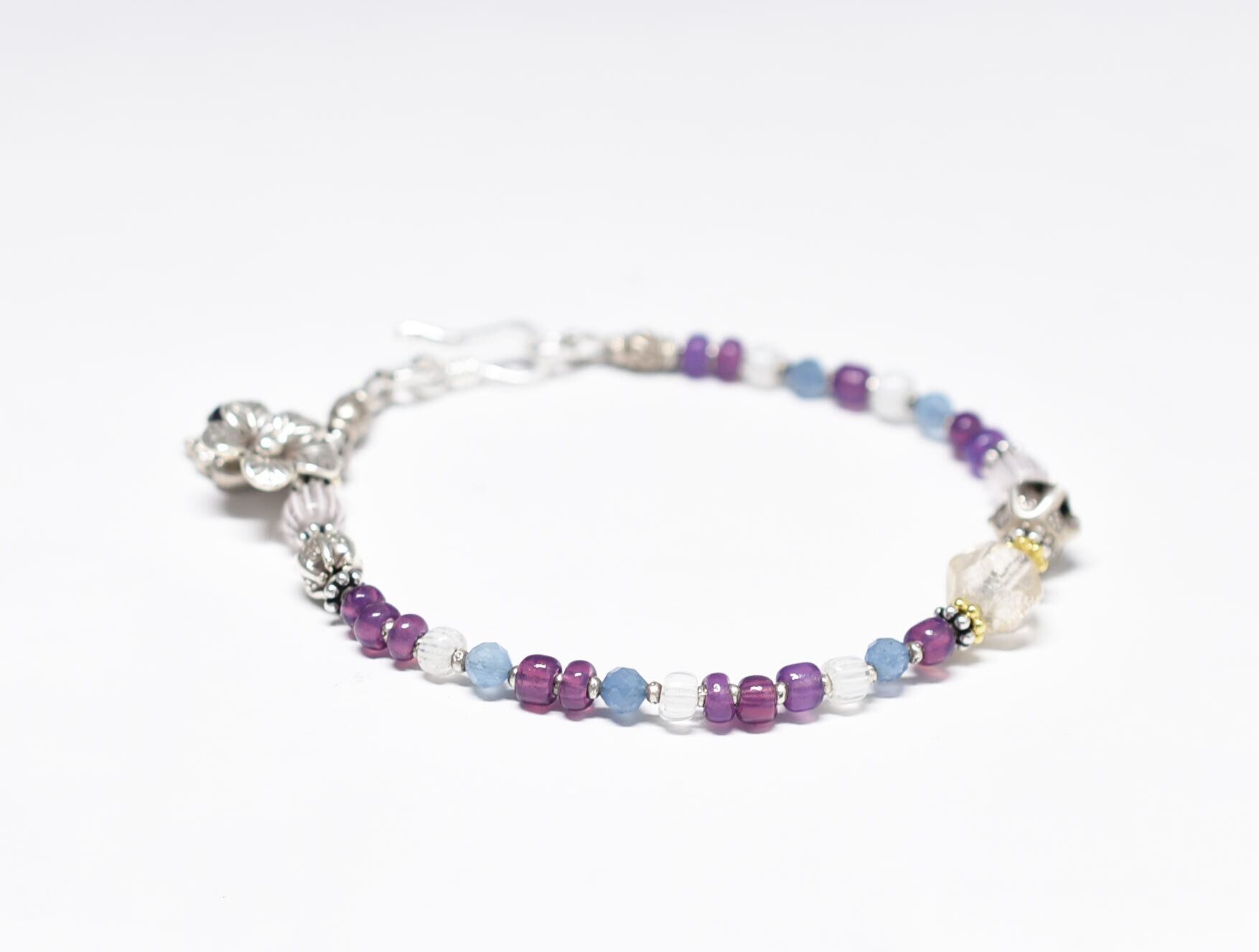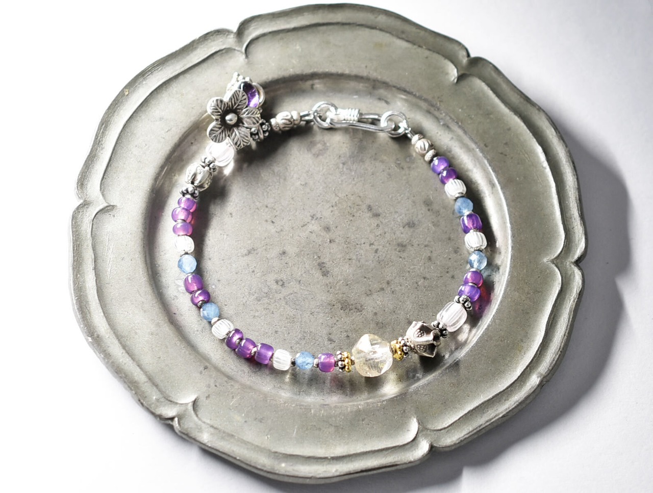 ヴィンテージオーロラビーズとカレンシルバー 、グーズベリー、すみれ色ビーズ、アクアマリン、シルバー装飾アメジスト&お花チャームのブレス