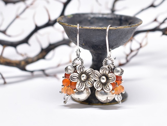 鈴とお花カレンシルバー、たわわなカーネリアン、クォーツ、インドシルバー鈴のピアス